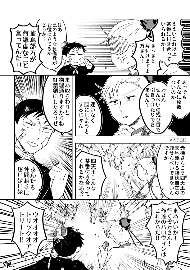 ちなみになんで鹿なのかというと四月馬鹿で古代オブザデッドとかやろうかなと思って頓挫したのと、ちょうどUSJでもハロウィンでゾンビに追いかけられるのやってるしでゾンビものにしようかなと思ってそういや今正倉院展やってるな行きたいなとか奈良の鹿って鹿せんべい持ってるのに焦らしてあげないと襲ってきたりするし常時トリックオアトリートじゃん?とか思いついて最終的に鹿になりました。お前は何を言ってるんだ